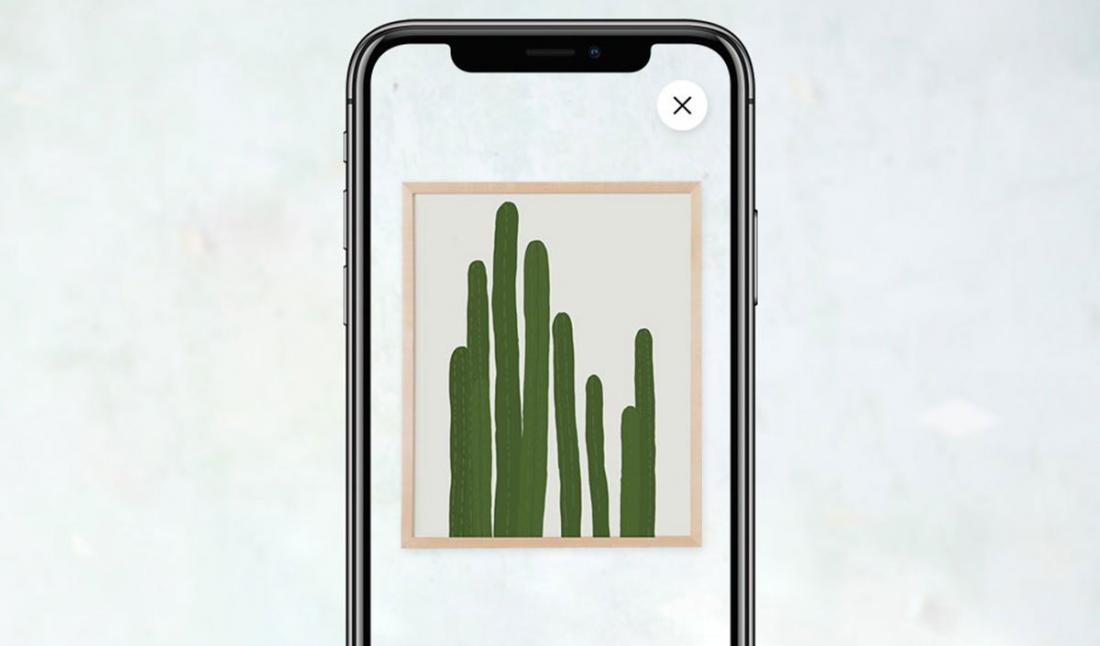Для того чтобы представить, как будет висеть картина на стене, нужно выбрать товар из категории "Картины", "Фотография" или "Печать", а затем коснуться значка дополненной реальности в верхнем правом углу изображения элемента. После этого нужно сканировать стену так, чтобы в кадр вошли потолок и пол.