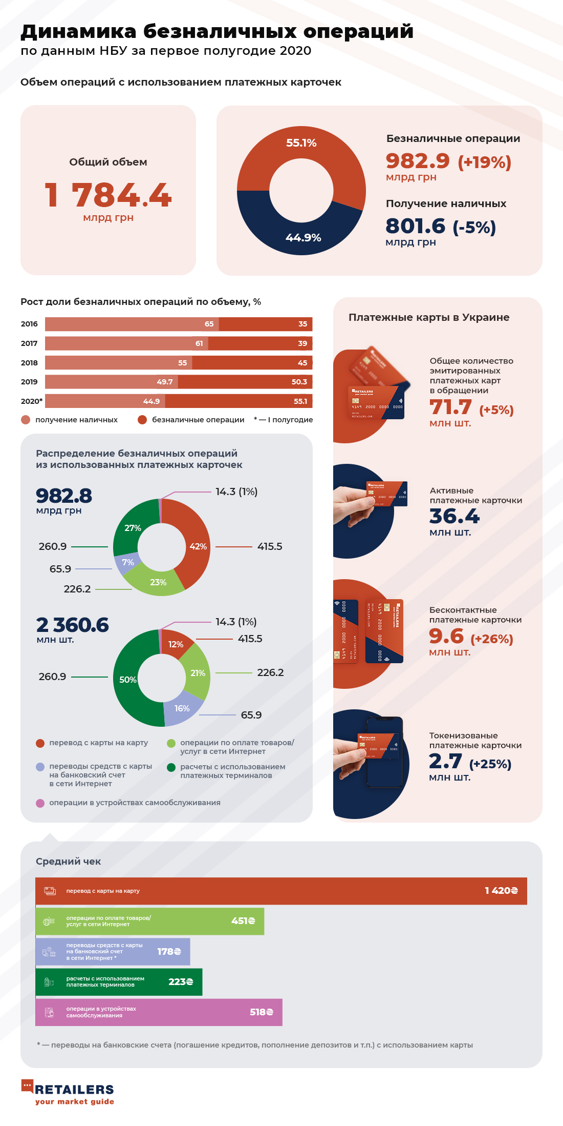 Безналичные операции с использованием бесконтактных и токенизированних карт (с помощью смартфонов и других NFC-устройств) составляли половину от общего количества и суммы безналичных операций в торговых сетях (50,1% и 50,9% соответственно). Тренд на бесконтактные безопасные расчеты только усиливаться.