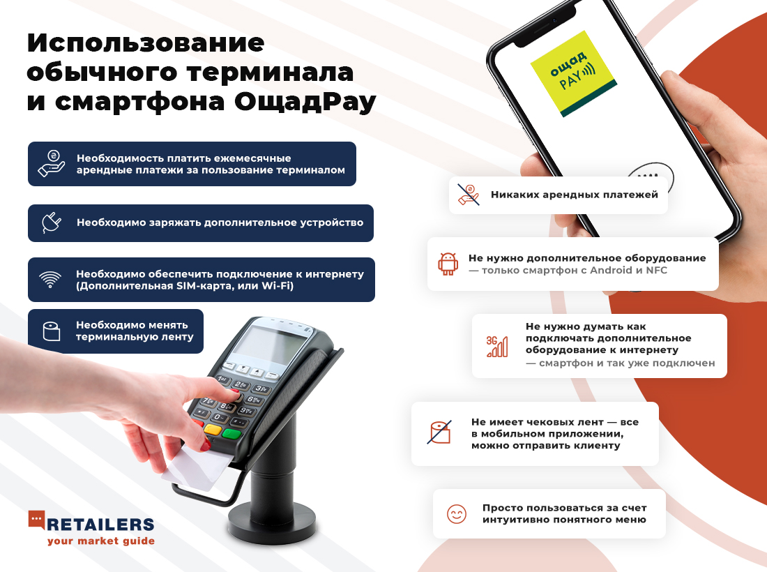 ОщадPAY - это легальный для бизнеса способ получить оплату с помощью смартфона, в отличие от «с карты на карту» между физическими лицами. А клиенту не нужно вводить номер карты и верифицировать перевод - просто приложить свою карту (или NFC-гаджет) к смартфону с ОщадPAY.