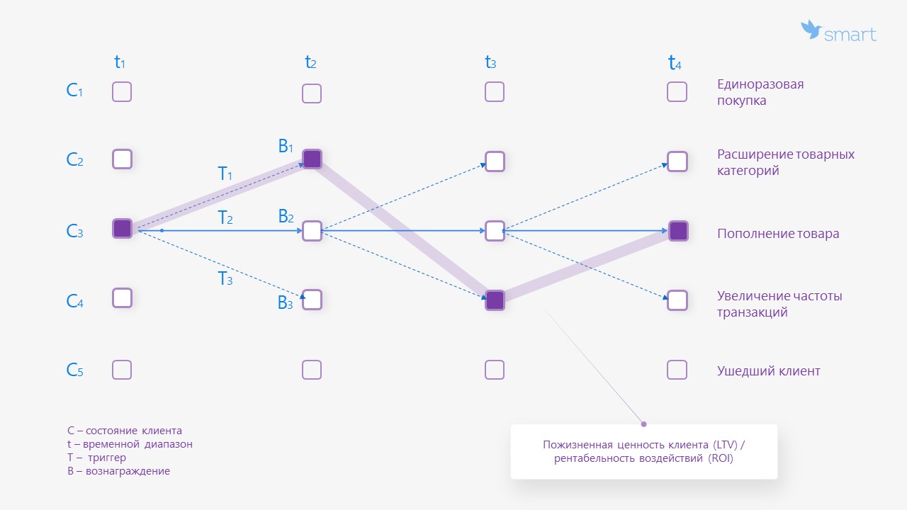 Переход клиента от состояния к состоянию сопровождается каким-либо воздействием: внешней среды, промо, ценообразования, акций или времени контакта. Грамотное воздействие позволяет усиливать намерение клиента быть лояльным или расширить опыт с нами, или же быть неудовлетворенным и уйти к конкуренту.