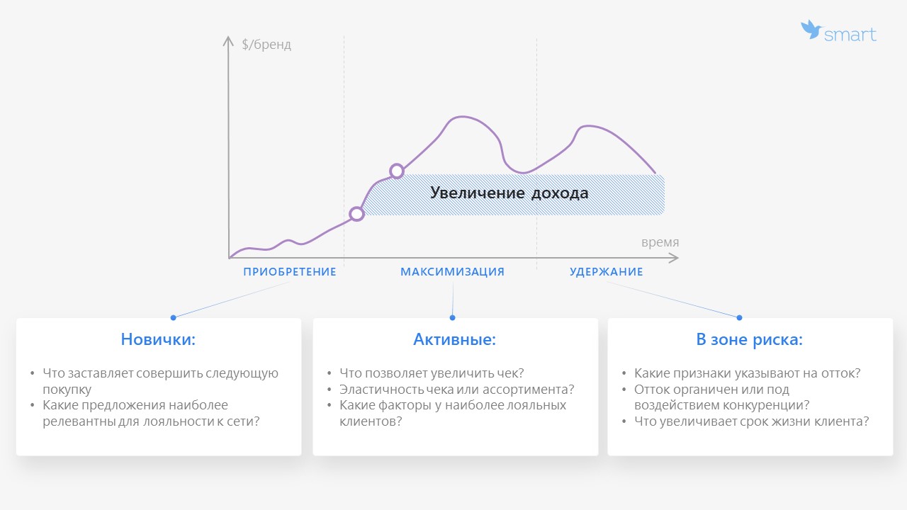 Понять, какие максимизационные стратегии могут применяться к клиентам: продление жизненного цикла, расширение ассортимента, повышение эластичности чека (рамки, в которых клиент может увеличить свой чек).