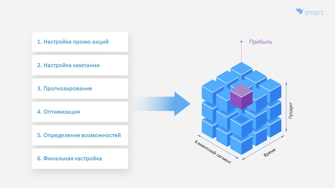 Планирование промо похоже на складывание кубика Рубика, который состоит из таких направлений, как продукты, товарный ассортимент, временной контекст и клиентская база. Сегментов очень много, и из каждого хочется получить максимальный эффект. Задача алгоритма – упростить работу специалиста в выработке рекомендованных значений по промо-планированию.