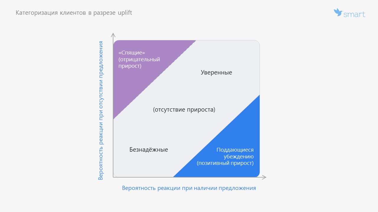 Клиенты, поддающиеся убеждениям. Кажется, что таких клиентов просто найти. Но практика показывает, что есть очень много факторов для определения таких клиентов: стимул, канал, товар, момент жизненного цикла, тип дисконта, количество баллов.