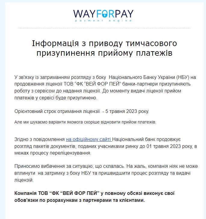 У зв'язку із затриманням розглядом з боку НБУ на подовження ліцензії ТОВ "ФК ВЕЙ ФОР ПЕЙ" банки партнери призупиняють роботу із сервісом Way For Pay до надання ліцензії. Орієнтовний строк отримання ліцензії — 5 травня 2023 року. Про це йдеться в електронному листі бізнес-клієнтам, копія якого є у RetailersUA