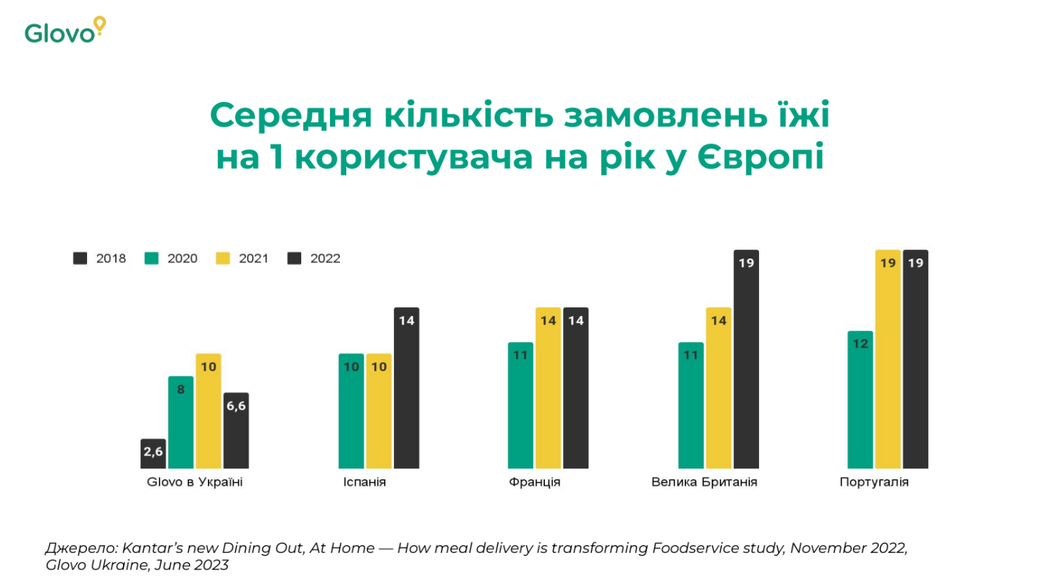У 2021-му в середньому один користувач Glovo в Україні робив приблизно 10 замовлень їжі на рік. У 2022-му цей показник опустився до 6,6 замовлень