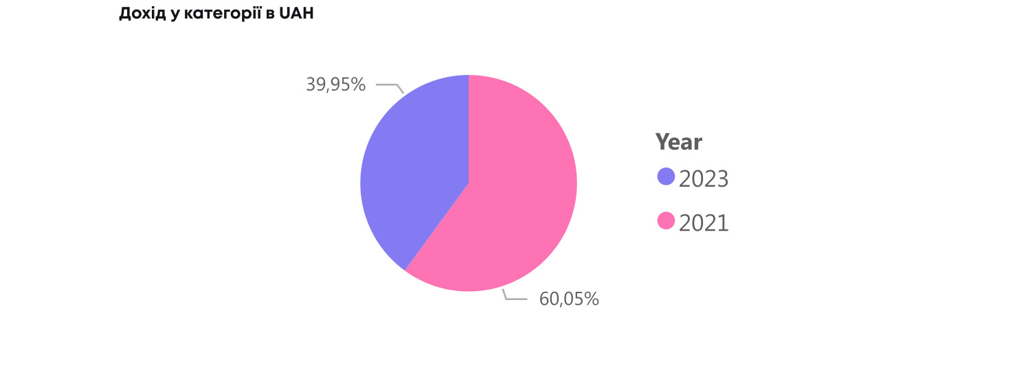 - Ніша показує позитивну динаміку. 2023 рік на 17% у гривні перевищив дохід 2021, у доларах — зріс на 2%. Зростання почалося у 3 кварталі, а особливо помітні зміни розпочалися з 4 кварталу 2023 року. Втім листопад відпрацював на 7% гірше, ніж у 2021-му у доларах, а в гривні — на 24% гірше. Важливо зазначити, що у 2023-му один з дуже великих гравців значно знизив свою присутність на ринку.
