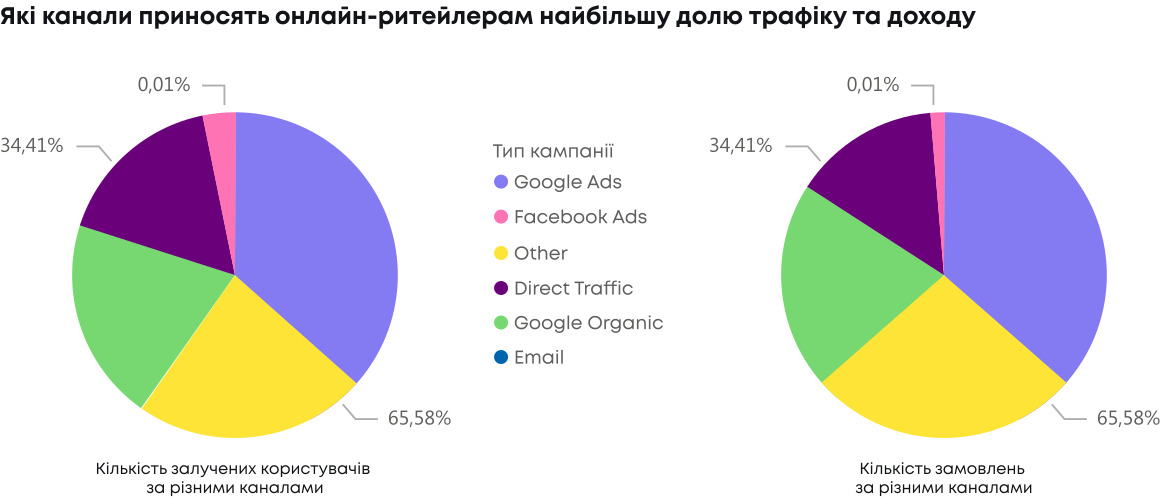 - Використання рекламних каналів у розрізі всіх ніш: найбільш ефективним каналом з залучення трафіку у 2023-му став Google Ads. На другому місці — Others (тобто реферальний трафік, трафік з кастомними utm, трафік з соцмереж тощо). Третій за ефективністю — канал органічного пошуку. Четверту сходинку займає Direct. З цього робимо висновок, що у 2024-му ритейлерам не можна ігнорувати платне просування в Google, а також інвестиції в SEO та бренд. Вимкнувши один з цих каналів — ви віддасте своїх клієнтів конкурентам, оскільки боротьба лише посилюється.