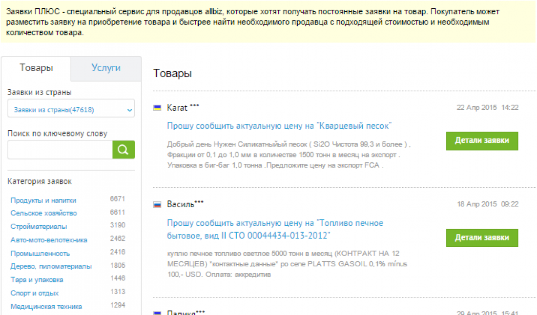 — Можно сказать, что «Заявки Плюс» — это список запросов заказчиков. Покупатель уверен в том, что если он отправил заявку поставщику и тот не ответил ему в течение 24 часов, то заявка попадет в «Заявки Плюс» и на его запрос смогут ответить сразу несколько поставщиков. Или же заказчик может разместить заявку в базу «Заявки Плюс» в ту категорию, в которой он ищет товар. Поставщики могут просматривать эти заявки, открывать их, связываться с заказчиками и общаться по поводу сделки.