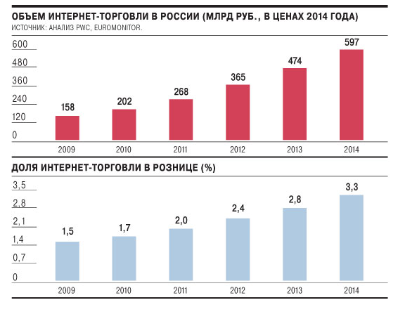 Объем рынка интернет-торговли в России по итогам 2014 года вырос на 25,9%, до 597 млрд руб., подсчитали в PwC. Таким образом, онлайн-продажи составляют только 3,3% от общего объема ритейла. Об этом пишет Коммерсант