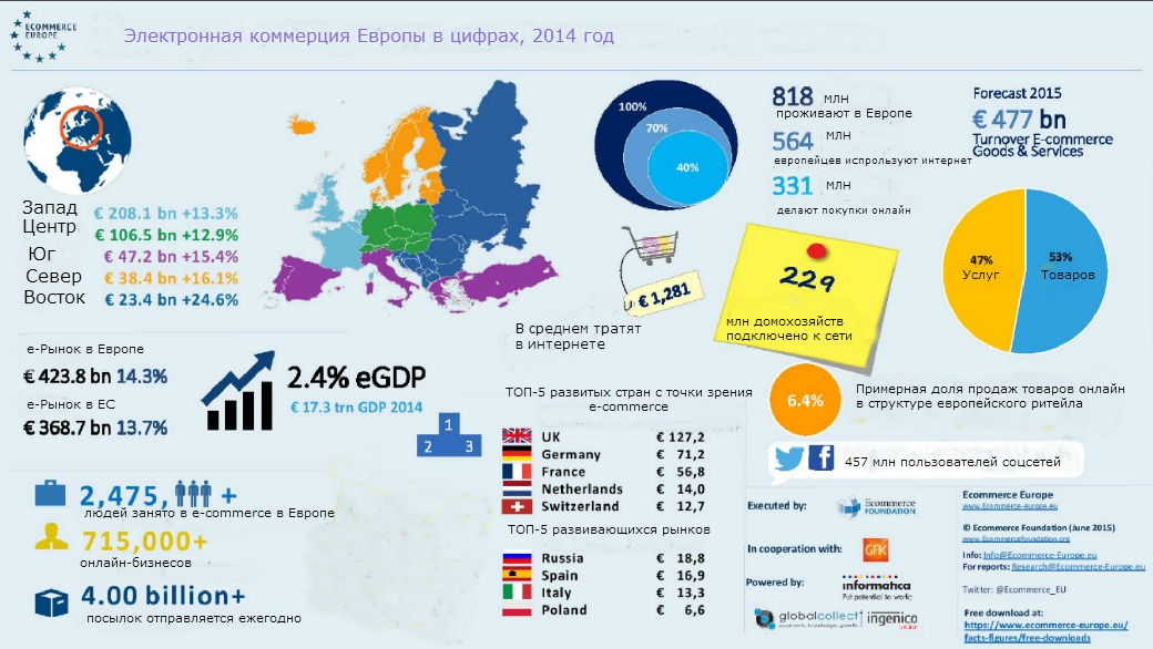 Электронная коммерция — одна из немногих растущих отраслей в регионе. Сейчас она обеспечивает 2,45% ВВП Европы. Но ожидается, что уже через пять лет эта цифра будет 6%. В e-commerce задействованы 2,5 млн человек — они продают товары и услуги онлайн и отвечают за доставку. Крупнейшим электронным рынком в Европе является Великобритания. Оборот e-commerce в этой стране достиг EUR127 млн по итогам 2014-го. Это почти 15% от общеевропейского оборота. За Британией следуют Германия и Франция. Их оборот составляет EUR71 млрд и EUR56 млрд соответственно. Несмотря на то, что Западная Европа — самый крупный регион по деньгам, в показателях роста лидирует Центральная и Восточная Европа, где прирост обеспечивает Россия. Электронная коммерция в этой стране выросла на 25,4% в прошлом году — до EUR18,8 млрд.