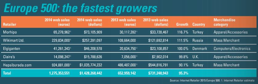 Но Amazon — не самая быстрорастущая компания в электронной коммерции в Европе. Первое место занимает турецкая розничная компания Morhipo, которая продает одежду и аксессуары онлайн. Ее продажи в прошлом году выросли на целых 116,7% до EUR65 млн. Другие быстрорастущие компании — Wikimart (Россия), Elgiganten (Дания), Claire’s (Великобритания) и Hepsiburada.com (Турция).
