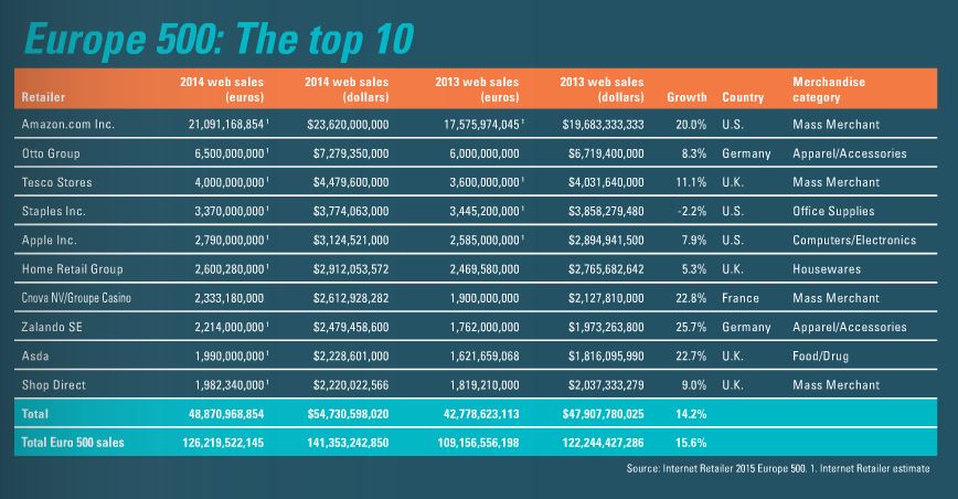 В первую десятку ежегодного рейтинга лучших интернет-торговцев в Европе, по версии Internetretailer, вошли Amazon, Otto Group, Tesco Stores, Staples, Apple, Home Retail Group, Cnova, Zalando, Asda и магазин Direct. Суммарные продажи всех крупнейших интернет-магазинов в Европе в 2014 году по сравнению с предыдущим годом выросли на 15,6%. Их коллективные онлайн-продажи выросли до EUR124 млрд. Топ-500 европейских интернет-магазинов генерирует 29% всех европейских продаж электронной коммерции