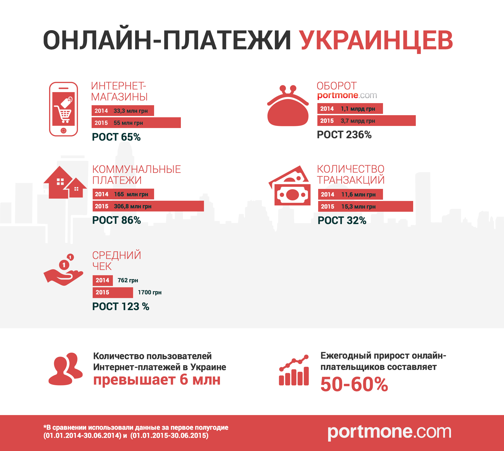 В текущем году, несмотря на сложную экономическую ситуацию в стране, цифры не менее внушительные. Только в первом полугодии 2015-го украинцы воспользовались сервисом Portmone.com 15,3 млн раз (в первом полугодии 2014-го — 11,6 млн раз), а оборот составил 3,7 млрд гривен. Рост по сравнению с аналогичным периодом прошлого года, когда объем операций был 1,1 млрд гривен, составил 236 %. При этом пользователи потратили на 65 % больше денег на покупки в интернет-магазинах (33,3 млн гривен в первом полугодии 2014-го в сравнении с 55 млн гривен в первом полугодии 2015-го), а интернет-платежи за коммуналку увеличились со 165 млн гривен до 306,8 млн гривен (86 %).