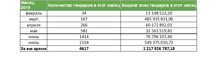 Количество тендеров, проведенных с помощью системы государственных электронных закупок ProZorro, ежемесячно удваивается. Если в феврале было проведено всего 34 тендера, то в июле уже 2 154, общий бюджет всех тендеров превысил 1,2 млрд грн