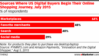В июле 2015 года был проведен опрос, призванный узнать, какую площадку онлайн-торговли пользователи выбирают в первую очередь, когда хотят что-то купить. Так, две трети американских покупателей заявили, что начинают с eBay, Amazon или Etsy, где представлен широкий спектр товаров от разных продавцов. Почти половина опрошенных сообщили, что начинают сразу с сайта уже полюбившихся им e-tailer’ов.