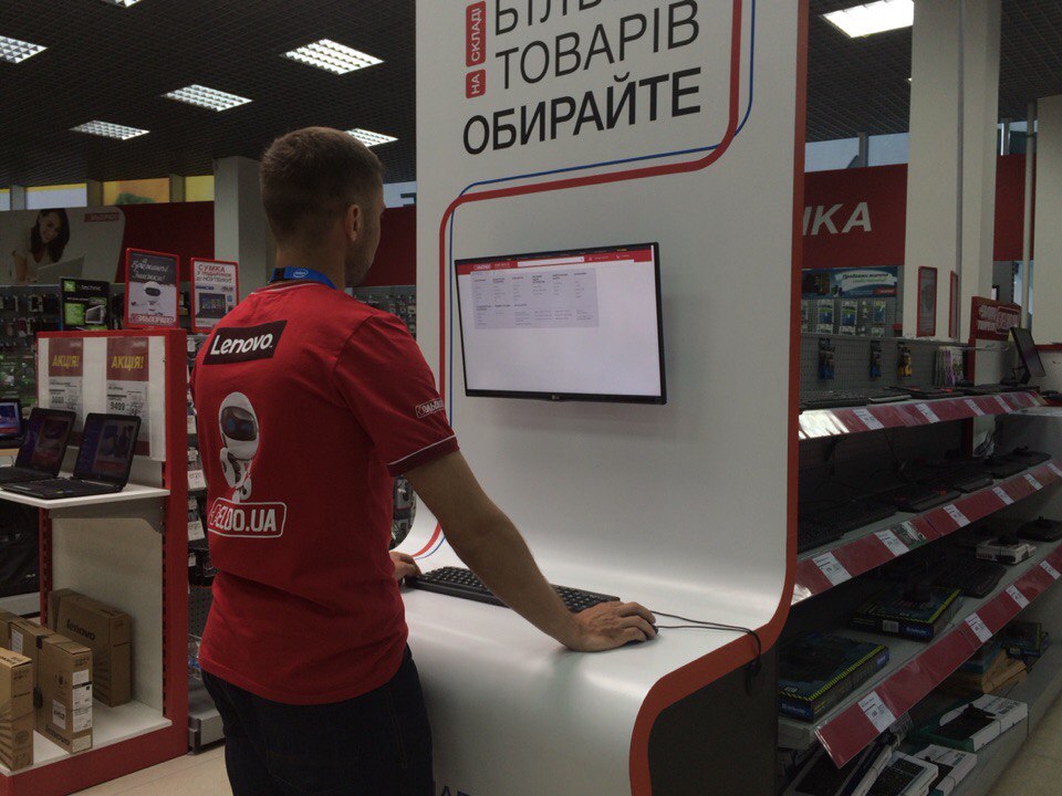 Электронная витрина представляет собой компьютер, монитор, клавиатуру и мышку. По словам Заблоцкого, это более привычные для большинства покупателей органы управления, поэтому в компании намеренно не делали сенсорную версию. Покупатель может воспользоваться витриной самостоятельно или с помощью продавца.