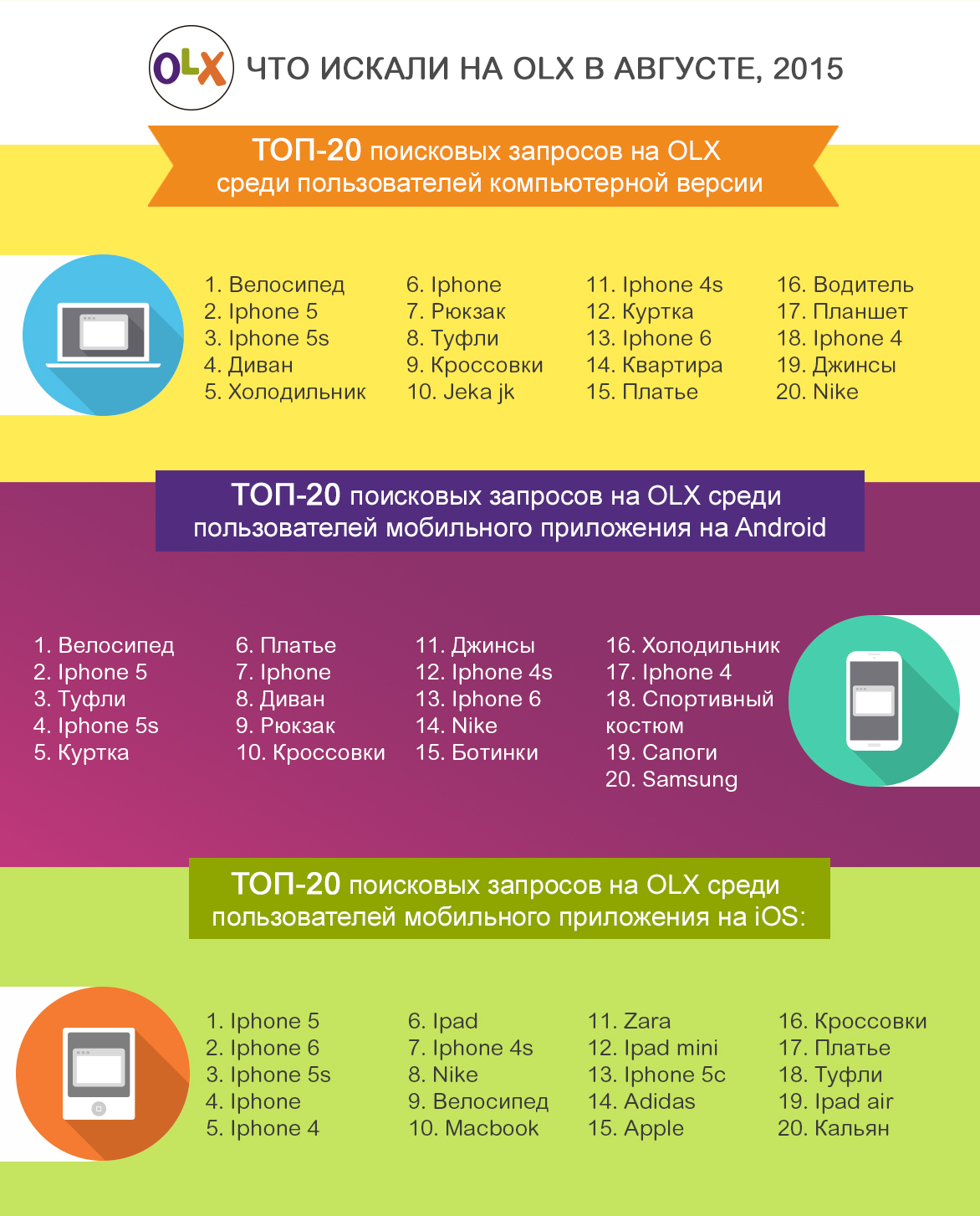 Немного больше половины пользователей — 53% — ищут, продают и покупают на OLX с помощью десктопа. В августе пятерка лидеров поисковых запросов осталась аналогичной результатам июля. «Велосипед» искали немного реже, но он по-прежнему остается запросом № 1. Поднялись в списке сезонные товары — рюкзак, куртка, туфли, кроссовки. Самым популярным брендом, как и раньше, остается iРhone. Интересный участник списка запросов jeka jk. Впервые эти бюджетные планшеты появились в списке топ-100 запросов на OLX в июне — и сразу в начале списка, на 13-м месте. В августе Jeka JK вошли в топ-10. Их искали около 60 000 раз.