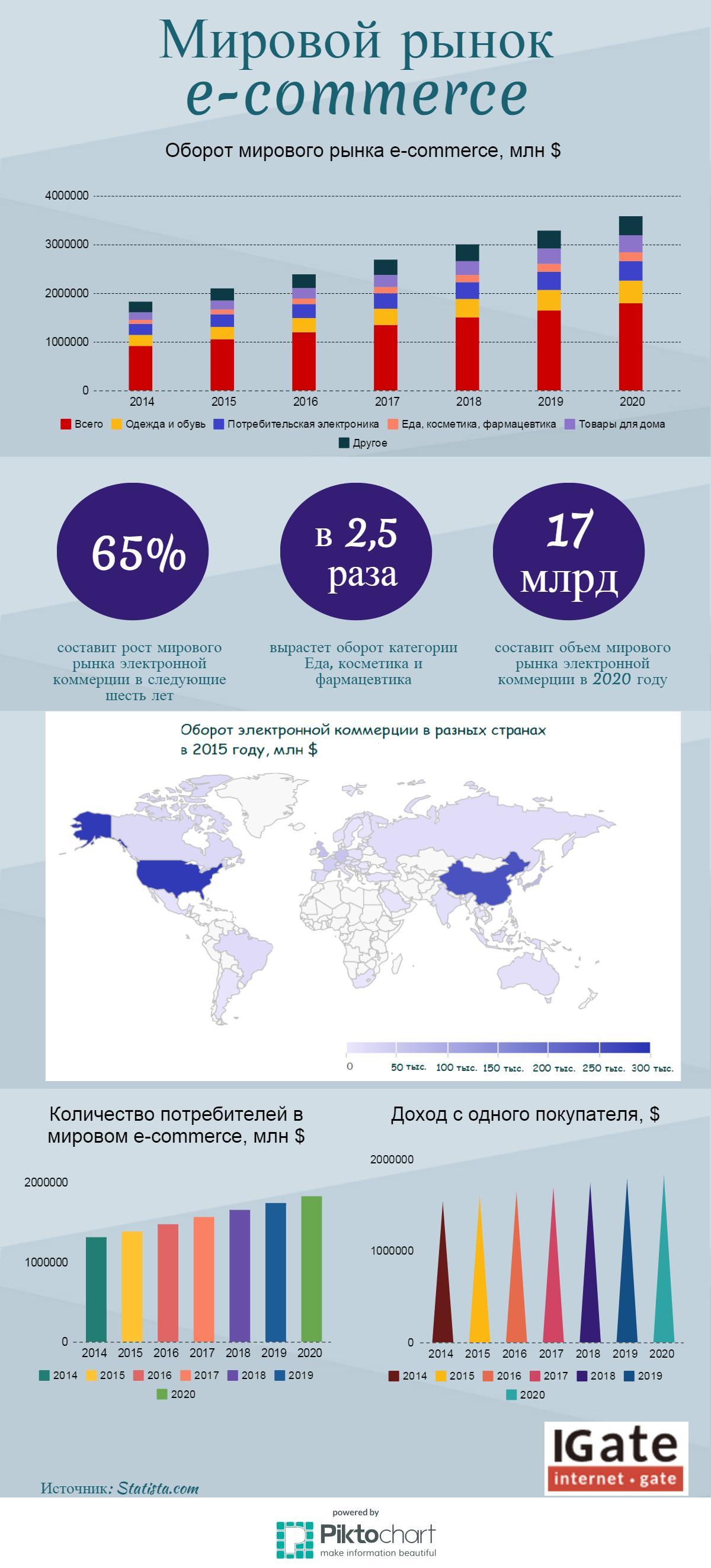 IGate сделал инфографику о том, как изменится мировой рынок электронной коммерции к 2020 году. Какие категории будут самыми востребованными? Какой доход с одного потребителя? Где самый крупный рынок e-commerce?