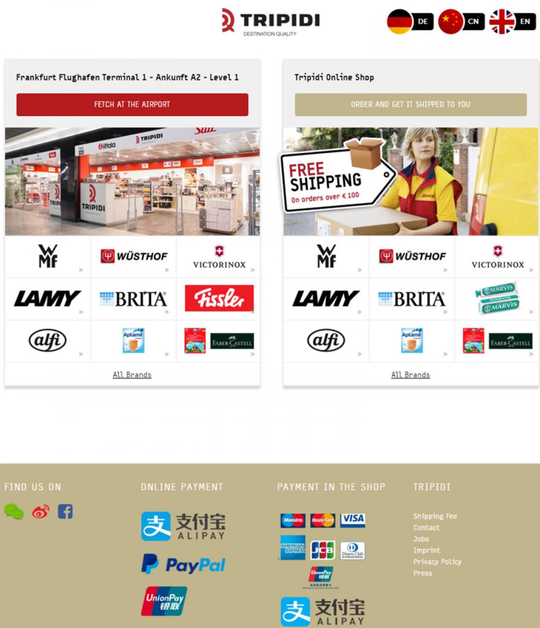 Опция оплаты через Alipay появилась и у ритейлера Tripidi. На данный момент это единственный оффлайн-магазин в Европе, где покупка может быть совершена с использованием китайской платежной системы. Представители Alibaba заявили, что планируют провести расширение сервиса в других странах Европы в ближайшем времени, с учетом тех сайтов, где наблюдается максимальное количество китайских пользователей. Однако подробности пока не сообщаются.