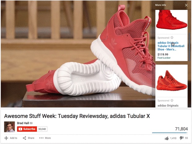 Этот формат рекламы был впервые представлен в начале этого года. Его суть сводится к тому, что рекламодатели смогут продемонстрировать свои товары прямо в видеоролике. То есть, покупатели смогут кликнуть по определенному товару и перейти на его страницу на сайте продавца. Показывать релевантные товары сервис будет динамически. Информация о товарах будет подгружаться из фидов в Google Merchant Center.