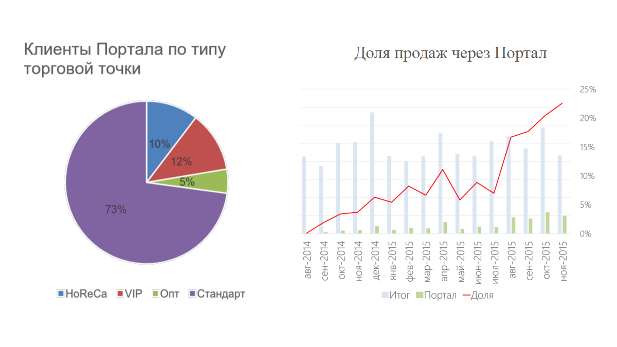 Когда мы начинали, мы не сильно понимали, каким торговым точкам это будет интересно. Рассчитывали в основном на Horeca — отели, рестораны и кафе, но больше всего порталом заинтересовались торговые точки. На сегодня доля продаж компании с помощью портала достигает 25%.