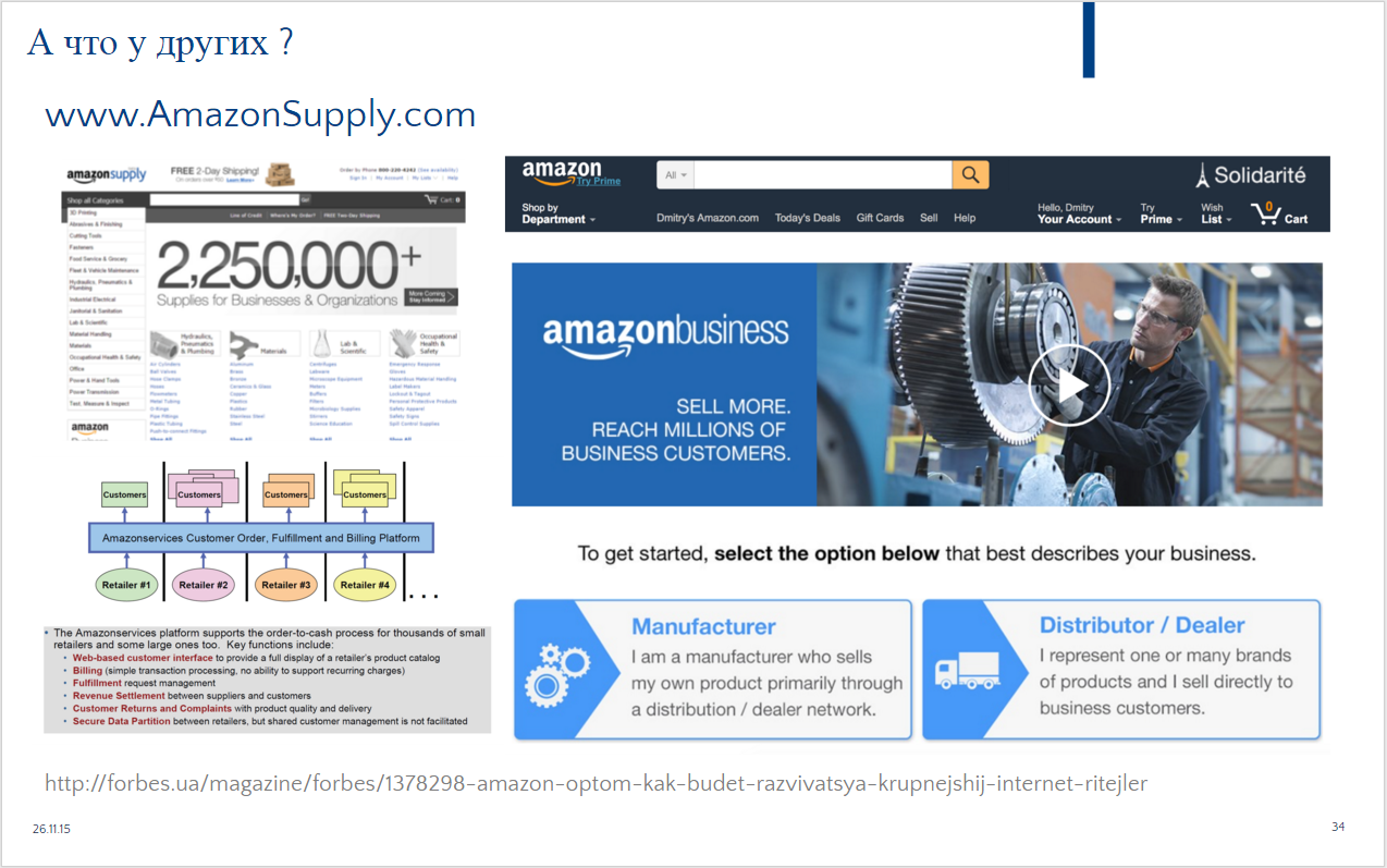 В мире уже давно существует AmazonSupply.com — схожая В2В-платформа, которая нигде особо не пиарится и потихоньку работает. На ней производители и дистрибьюторы выкладывают свои товары. Там представлено 2 млн поставщиков.