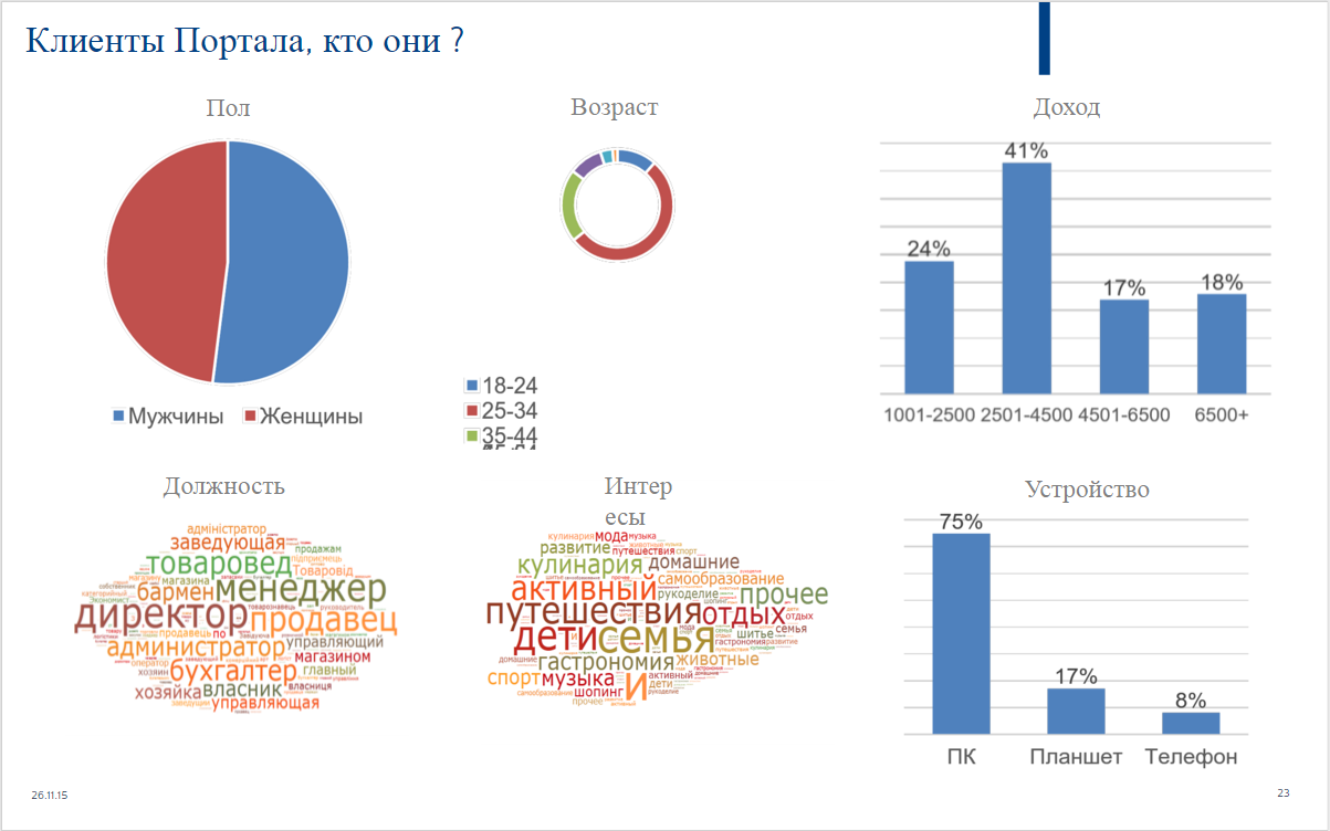 Конечно же, мы получаем аналитику по нашим клиентам, по полу, возрасту, должности, интересам. Это также используется в маркетинге и таргетируется.