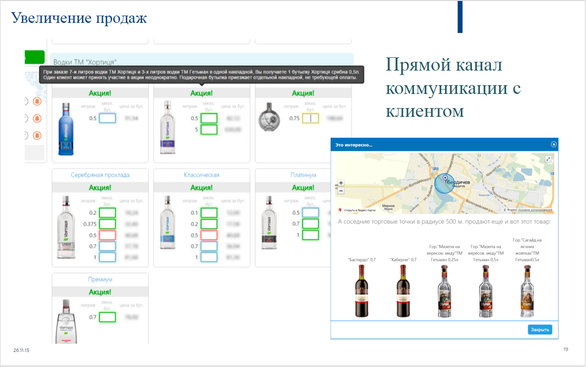 Торговый дом получил увеличение продаж и канал коммуникации с клиентом — все акции подсвечиваются. Некоторые позиции у клиента подсвечиваются желтым цветом — указано, что эти позиции заказывают «соседи» — точки рядом. С помощью gps-координат мы смотрим, какие заказы делает эта точка и точки вокруг. У этого инструмента конверсия около 35% — те клиенты, которые увидели, что у соседа эта позиция стоит на полке, тоже себе заказали.