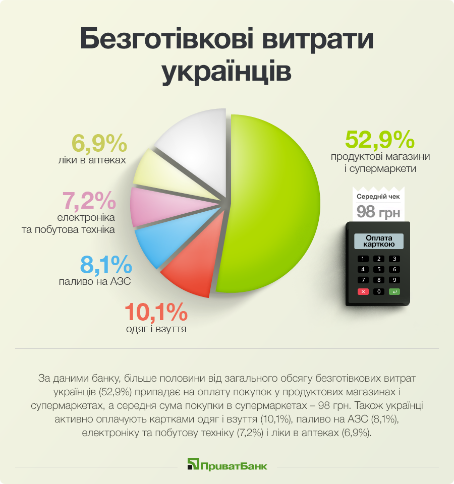По данным банка, больше половины от общего объема безналичных расходов украинском (52,9%) приходится на оплату покупок в продуктовых магазинах и супермаркетах, а средняя сумма покупки в супермаркетах — 98 грн. Также украинцы активно оплачивают карточками одежда и обувь (10,1%), топливо на АЗС (8,1%), электронику и бытовую технику (7,2%) и лекарства в аптеках (6,9%).