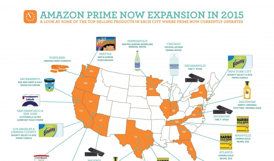 Также Amazon представил инфографику с популярными товарами, которые заказывают пользователи Prime Now в США. Например, в Нью-Йорке и Лос-Анджелесе наиболее востребованы бумажные полотенца Bounty, а в Лас-Вегасе — мороженое от Ben and Jerry’s.