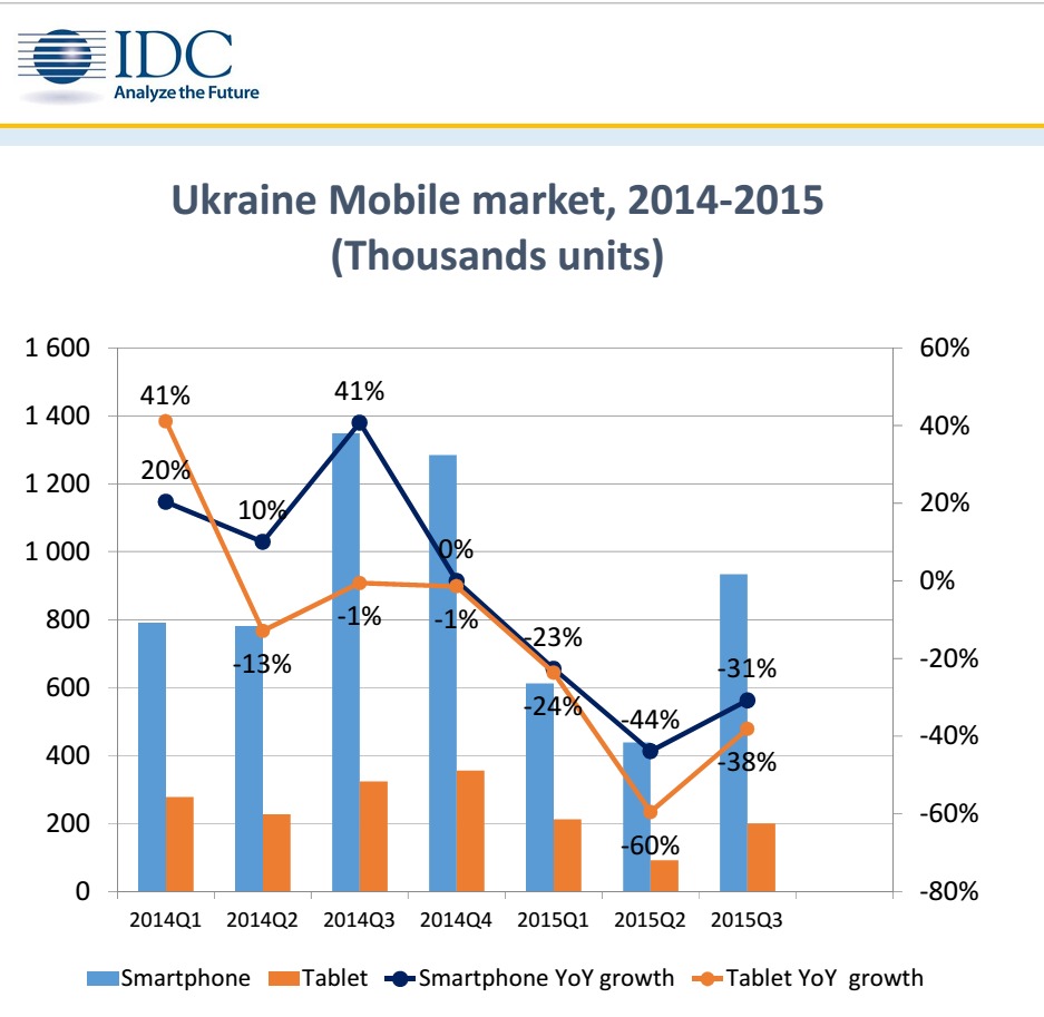 Согласно ежеквартальному отчету IDC Mobile Tracker рынок смартфонов Украины также сохраняет отрицательную динамику: падение в ІІІ квартале составило 30,8% в количественном выражении и более 40% — в деньгах. Тем не менее в период с июля по сентябрь в Украину было поставлено 934, 1 тыс. смартфонов и, таким образом ІІІ кв. оказался самым сильным в 2015 г., как в количественном, так и в денежном выражении. Доля смартфонов в общем количестве мобильных терминалов продолжает расти и составила в прошедшем квартале 58,3%, но все еще существенно отстает от показателей в регионе СЕЕ (73,1%).