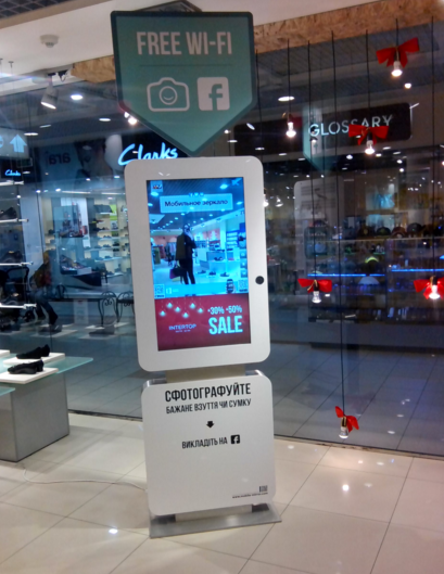«Интертоп» предлагает покупателям посмотреть на себя со стороны. Новинка — мобильное зеркало, напоминающее огромный планшет, — стоит прямо у одного из входов в магазин. Покупатели могут сделать селфи — запечатлеть себя с продукцией компании, используя смартфон, опубликовать фото в Facebook. От обычного зеркала мобильное отличается тем, что на нем изображение появляется с задержкой в несколько секунд, поэтому можно постараться, чтобы увидеть свой вид сзади.