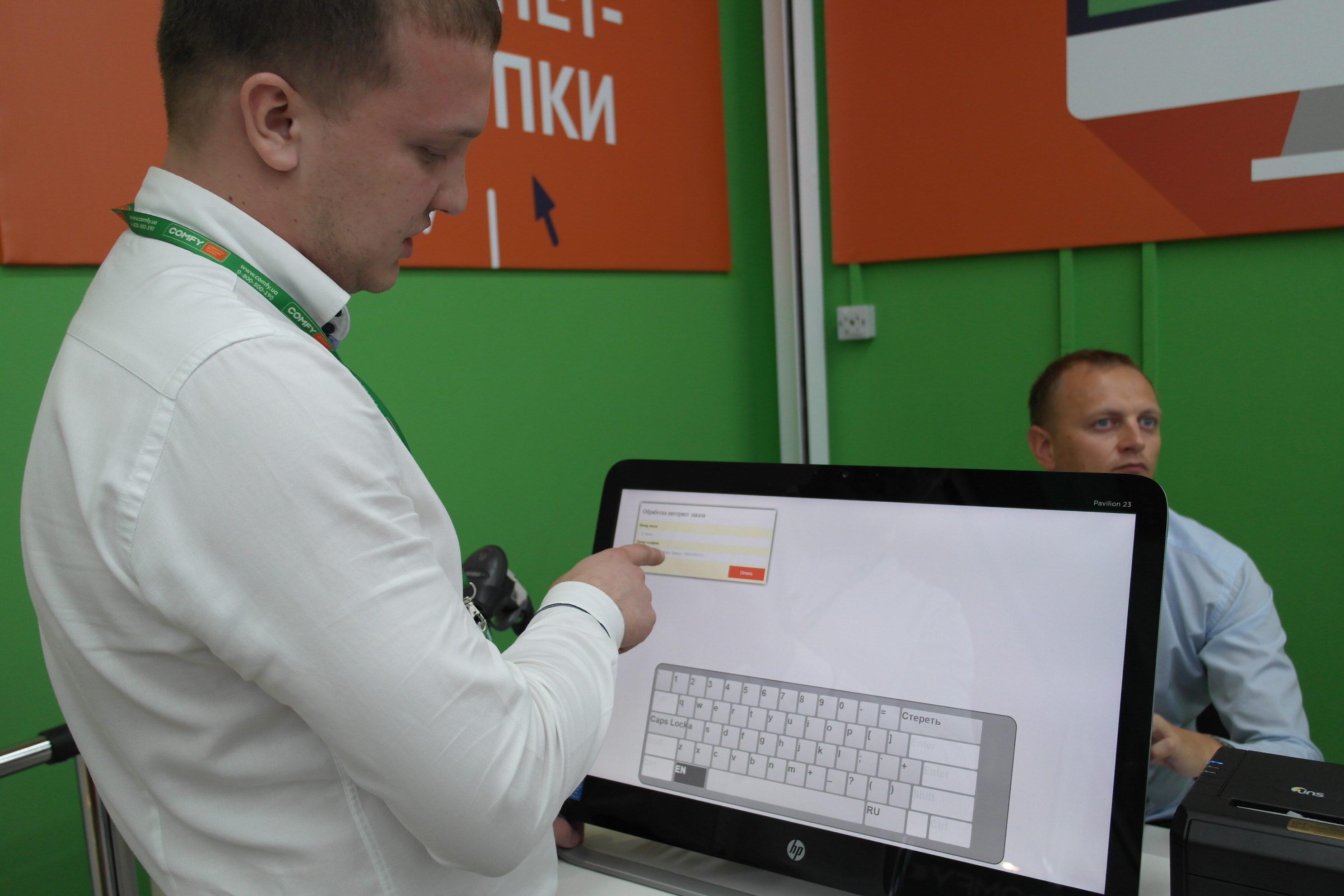 Электронная витрина представляет собой компьютер, монитор, клавиатуру и мышку. Покупатель может воспользоваться витриной самостоятельно или с помощью продавца.