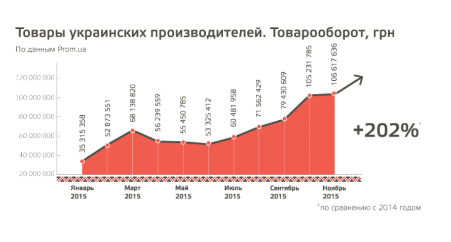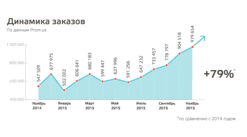 Количество заказов Prom.ua в ноябре 2015 года составило 979 654 шт., что на 79% больше по сравнению с ноябрем прошлого года. В 2015 году товарооборот в гривне увеличился на 106% и составляет в 2015-м 4,9 млрд грн. При этом размер среднего чека вырос на 21% и составляет 814 грн.