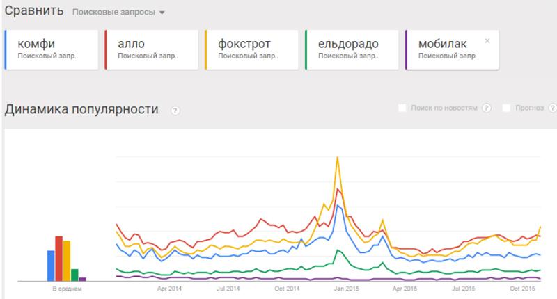 С помощью Google Trends вывели динамику по брендам с января 2014 года по ноябрь 2015 года: