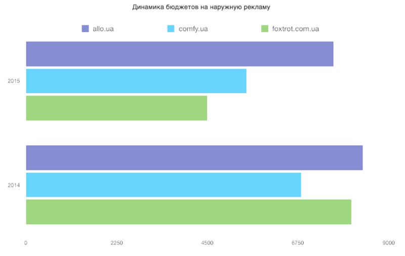 Одной из тенденций уходящего года стало перетекание бюджетов из офлайна в онлайн: в среднем крупные интернет-магазины сократили бюджеты на наружку в гривне на 23% (данные DOORS Consulting). Среди указанных магазинов самый большой бюджет на наружную рекламу был у «Алло», но даже он меньше прошлогоднего на 9%. Бюджет Comfy сократился на 20%, а «Фокстрота» — на целых 44%.