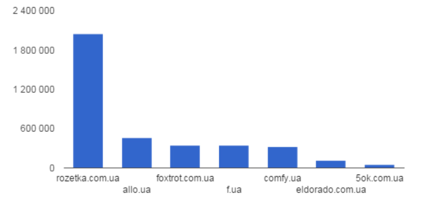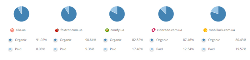 Основным платным источником остается Google Adwords. В среднем бюджет на контекстную рекламу в нише электроники составляет от 400 000 грн до 900 000 грн в зависимости от сезона. При этом не учитываются показатели «Розетки», где бюджеты, по оценке авторов исследования, доходят до 10 млн грн. Рекламные бюджеты распределяются так: