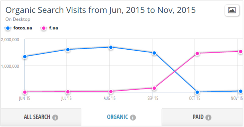Если говорить о динамике по бесплатному органическому трафику, лидером является, очевидно, «Розетка», так что авторы исследования исключили ее из графика (на фоне «Розетки» не наглядна динамика по другим игрокам). Учитывая это, самый активный рост по бесплатному поисковому трафику за уходящий год — у «Алло» и «Мобиллака». Интересно, что переход Fotos на новый домен в октябре 2015 года прошел без потерь в трафике: