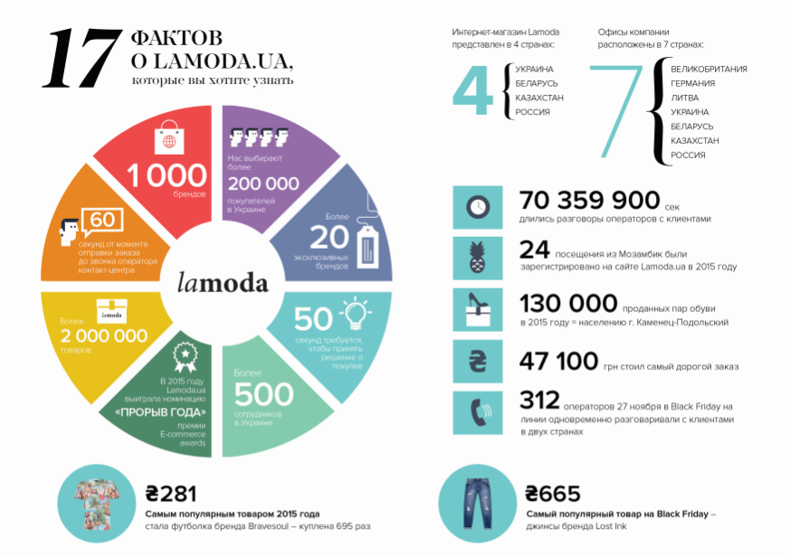 В декабре Lamoda.ua отметила двухлетие деятельности в Украине. За этот период клиентами Lamoda стало более 200 000 человек. Прирост посещаемости и заказов каждый год увеличивался почти в три раза. Lamoda.ua стал первым сайтом в Украине, который предоставил возможность приобретать в интернете вещи новых коллекций более 1 000 мировых брендов