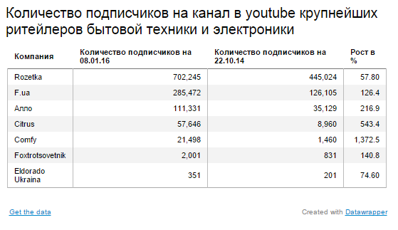 По данным исследовательской компании TNS, 69% людей ищут информацию о товарах и услугах онлайн, из них 31% делают покупку в интернете, 37% — в офлайне. Основатель крупнейшего интернет-магазина Rozetka Владислав Чечеткин одним из факторов успеха своего бизнеса называет создание канала на YouTube. Мы проанализировали, кто из крупных игроков делает ставку на этот канал и как выросло количество подписчиков за год