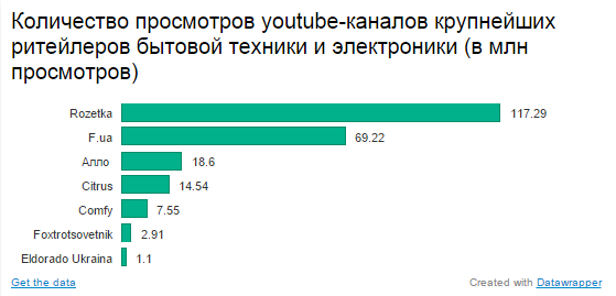 Выделяется YouTube-канал Rozetka — на канал подписались 702 245 человек, а количество просмотров роликов составляет 117,29 млн. У F.ua 69,22 млн просмотров и 285 472 подписчика. На канал «АЛЛО» в YouTube подписались 111 331 человек, а общее число просмотров составило 18,6 млн. Среди игроков рынка небольшим количеством подписчиков выделяются каналы Foxtrotsovetnik и Eldorado Ukraine, число которых соответственно составляет 2001 и 351 человек.