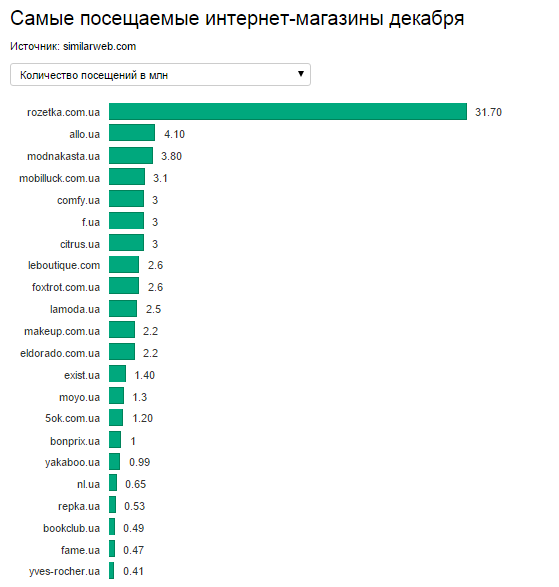 Самые посещаемые интернет-магазины декабря. Rozetka увеличила количество посещений на 4,9 млн просмотров
