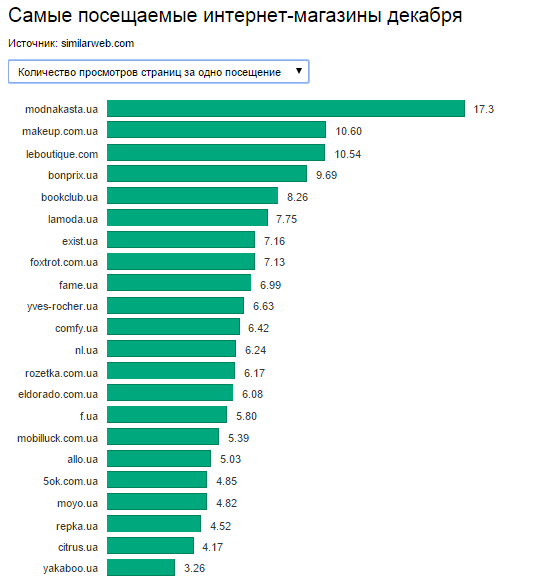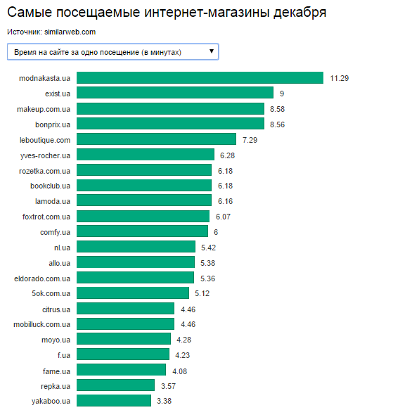 В декабре среди крупнейших интернет-магазинов значительный рост показала Rozetka.ua. Крупнейший онлайн-ритейлер увеличил количество просмотров на 4,9 млн. Allo.ua поменялся местами с ModnaKasta.ua и вышел на второе место, увеличив количество посещений на 0,5 млн. Третье место, соответственно, у ModnaKasta.ua. Больше всего времени пользователи проводили на сайте ModnaKasta (в среднем 11,29 минут), где просматривали почти 17 страниц