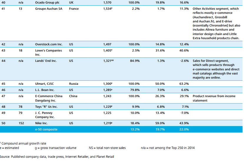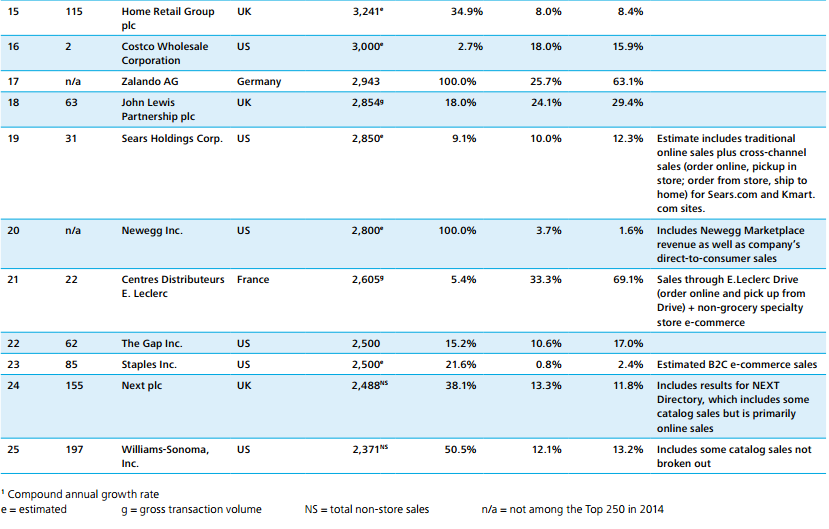 39 компаний являются omnichannel-ритейлерами. Одиннадцать компаний работают только в онлайне, в том числе Amazon. По оценкам продаж электронной коммерции $20,6 млрд, компании Apple заняла второе место. Сейчас прямые продажи для JD.com, крупнейшего в Китае ритейлера электронной розничной торговли, подскочили с 62 процентов в 2014 году до почти $17,7 млрд. Wal-Mart, с онлайн-продаж оценивается в US $12,2 млрд.