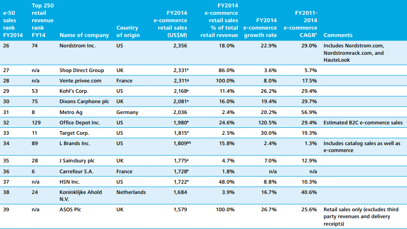 Компания Deloitte в 19-м годовом отчете Global powers of retailing 2016 выделила топ-50 глобальных онлайн-ритейлеров. В свой список, компания включает только электронную коммерцию B2C, где бизнес осуществляет продажи непосредственно потребителю