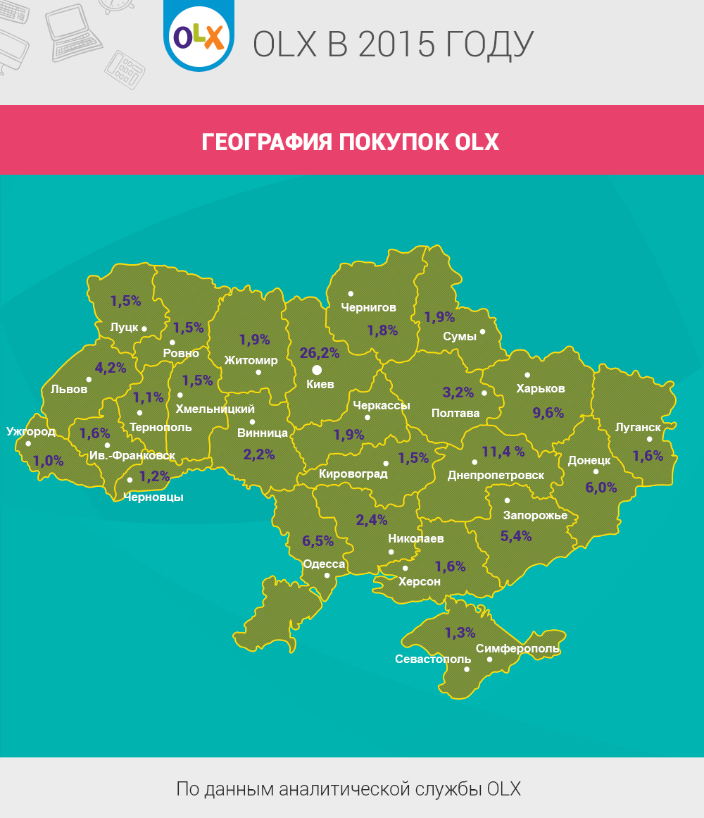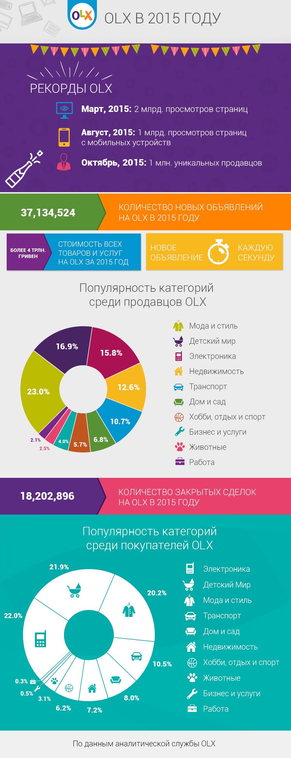 За 2015 год украинцами на OLX было опубликовано более 37 млн новых объявлений. Общая стоимость всех представленных товаров и услуг на площадке за год превысила 4 триллиона гривен. На протяжении года наибольшей популярностью среди продавцов пользовались потребительские категории. Стремясь заработать на ненужных для себя вещах, пользователи активно продавали одежду, обувь (категория «Мода и стиль» — 23% от общего количества новых объявлений на площадке), детские товары («Детский мир» — 16,9%), электронику и технику («Электроника» — 15,8%). В топ-5 самых популярных разделов по количеству новых объявлений также вошли «Недвижимость» (12,64%) и «Транспорт» (10,68%).