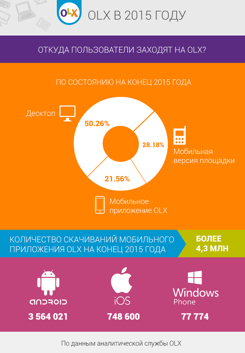 Посещаемость сервиса OLX росла на протяжении всего года. Каждый второй интернет-пользователь из Украины посещает сервис минимум один раз в месяц. Согласно данным Gemius, число пользователей площадкой составляет более 7,5 млн человек в месяц (декабрь 2015-го). Причем посещаемость и просмотры страниц площадки с мобильных устройств росли значительно динамичнее, чем с десктопа. По состоянию на конец года уже половина пользователей посещали OLX именно с мобильных устройств — 22% посещений пришлось на мобильную версию сервиса и 28% — на мобильное приложение. Количество скачиваний мобильного приложения OLX на конец 2015 года превысило 4,3 млн: Android — более 3,5 млн загрузок; iOS — около 750 000; Windows Phone — больше 77 000.