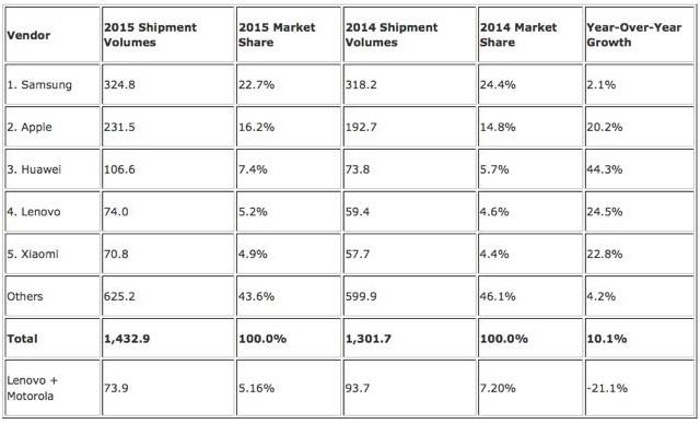 Исследовательская компания IDCIDC публиковала отчёт за 2015 год по объёму поставок смартфонов. Согласно этим данным, за прошедший год производителями были отгружены рекордные 1,43 миллиарда смартфонов. Samsung по-прежнему остаётся лидером, поставив 324,8 млн устройств за указанный период, что на 2,1% больше по сравнению с 2014 годом. Также в пятерку лидеров попали Apple, Huawei, Lenovo и Xiaomi. Все эти компании за 2015 год увеличили объёмы поставок более чем на 20%, а Huawei — и вовсе на 44,3%, увеличив свою долю на рынке с 5,7% до 7,4%