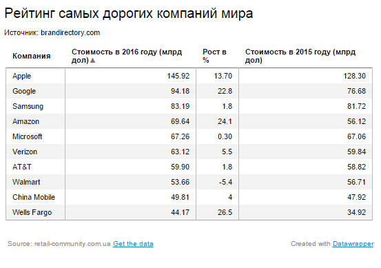 Американская технологическая корпорация Apple вновь стала самой дорогой компанией в 2016 году (по сравнению с прошлым годом ее стоимость выросла на 13,7%, до $145,9 млрд).