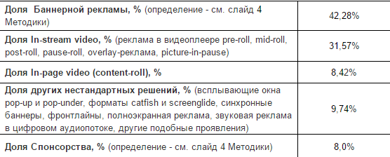 Для сравнения с долями сегментов рынка по итогам 1-го полугодия 2015 — доля банерной рекламы составила 40,7%, In-stream video 25,4%, In-page video 12,5%, Доля спонсорства - 12,2%.